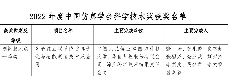 8月4日,中国仿真学会发布《2022年度中国仿真学会科学技术奖获奖名单》,由国防科技大学、华体网页版登录入口_华体(中国)科技、漳州科华技术有限责任公司合作完成的“多能源互联系统仿真优化与智能调度技术及应用”项目荣获中国仿真学会科学技术奖-创新技术奖一等奖。