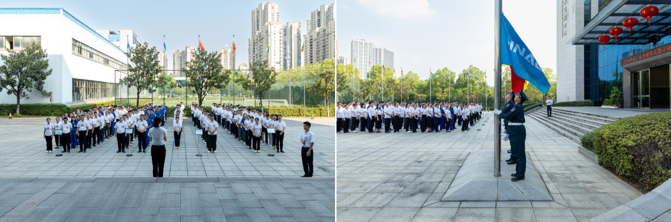 员工代表们整齐列队,注视着五星红旗与公司司旗冉冉升空