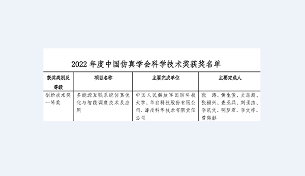 8 月 4 日,中国仿真学会发布《2022年度中国仿真学会科学技术奖获奖名单》,由国防科技大学、华体网页版登录入口_华体(中国)科技、漳州科华技术有限责任公司合作完成的“多能源互联系统仿真优化与智能调度技术及应用”项目荣获中国仿真学会科学技术奖-创新技术奖一等奖。