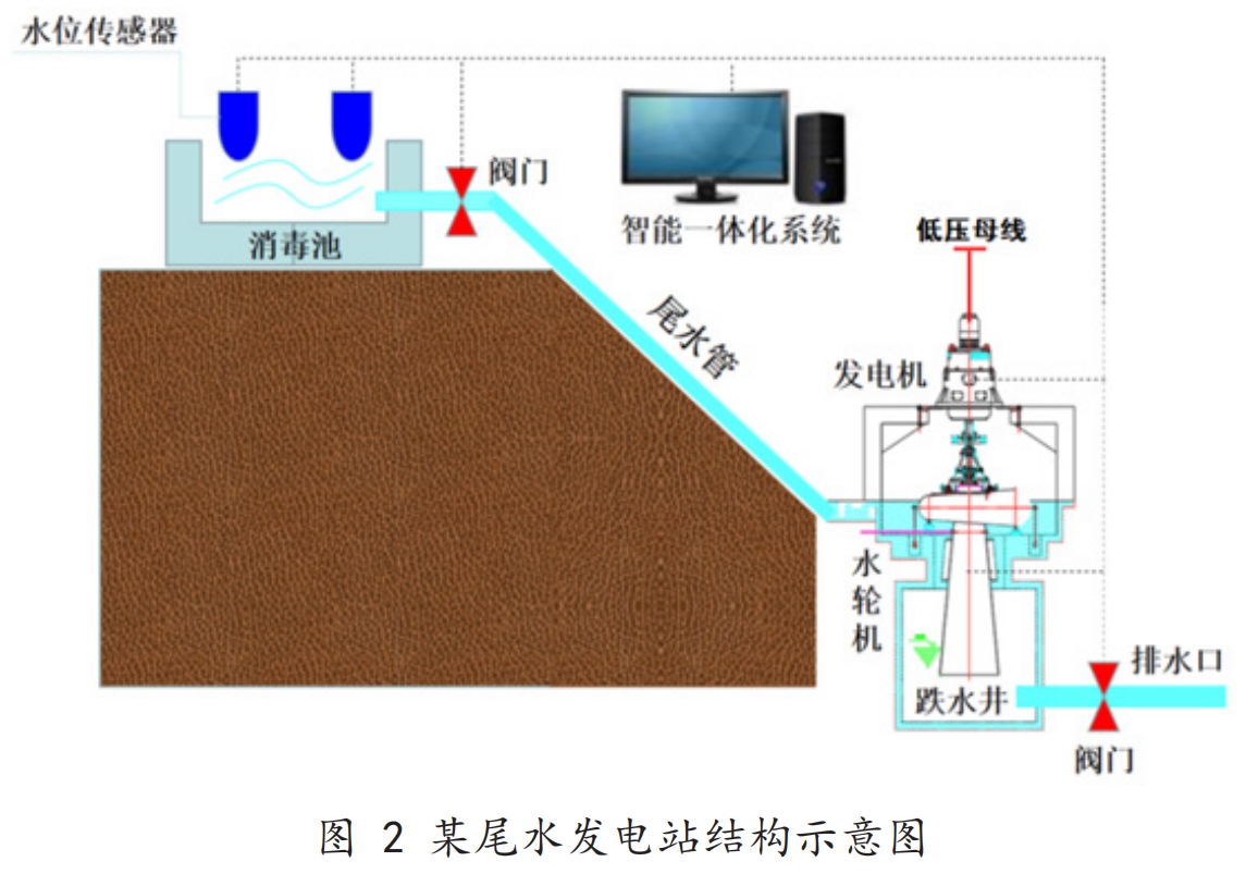 某水质净化厂日处理水量 12.5 万吨,出水水位落差 8 米,经技术改造后,水电装机容量为 85kW,年发电量 45 万 kWh。电站平均每年可节约标准煤 161.48 吨,减排二氧化碳 442.5 吨。电站结构示意图如图 2 所示,控制设备布置如图 3 所示。